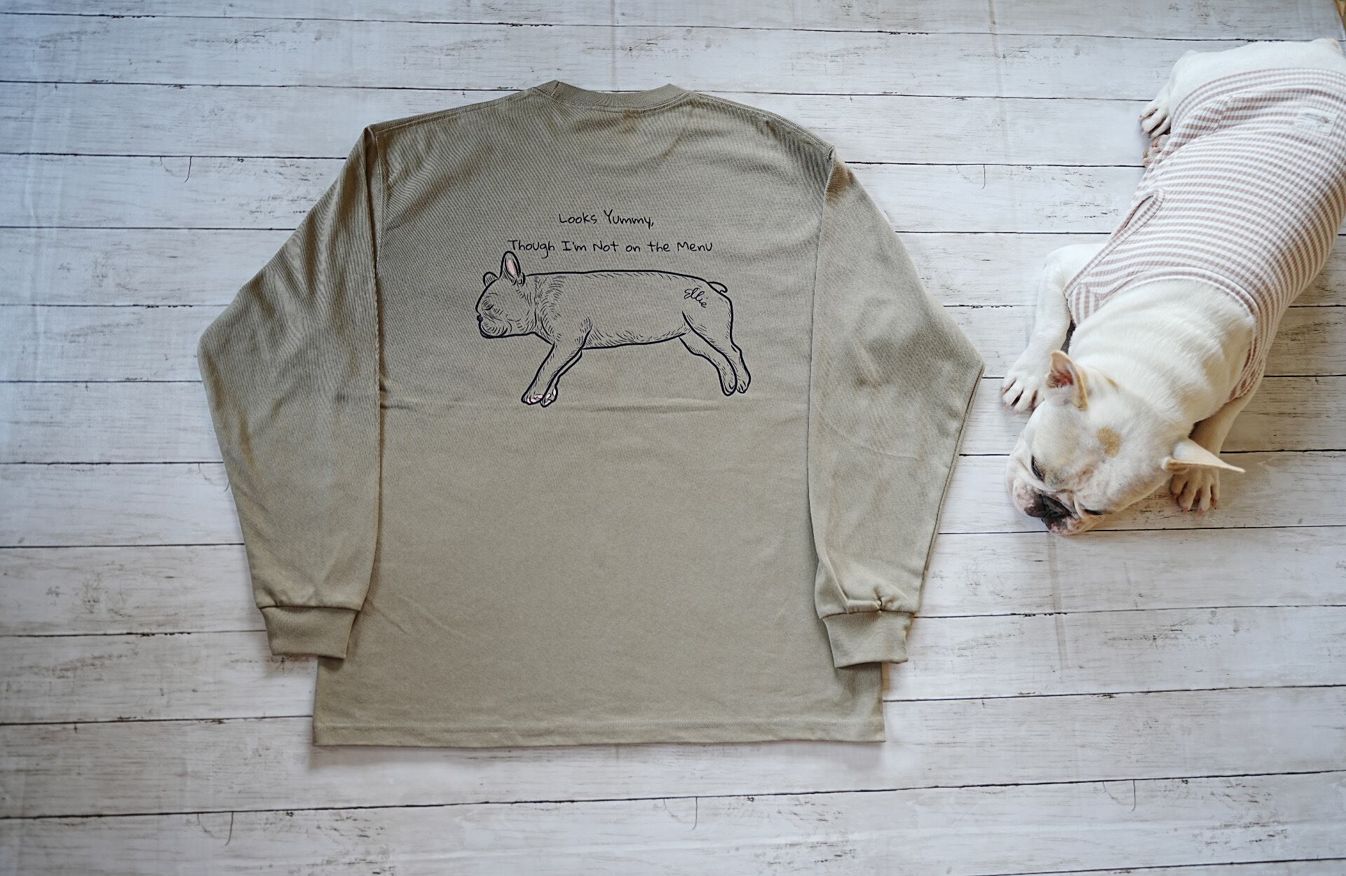 カーキボディに、背面いっぱいのフレンチブルドッグのイラスト。