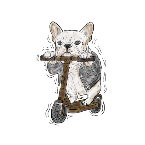 前面に描かれているのは、はじめて電動キックボードに乗るフレンチブルドッグ。