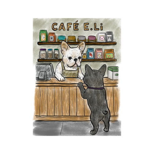 店員のホワイトとお客さんのブリンドル――どちらも人のように擬人化することなく、