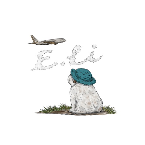 スーツケースに手を載せ、こちらを見つめるフレンチブルドッグを描いたデザインです。