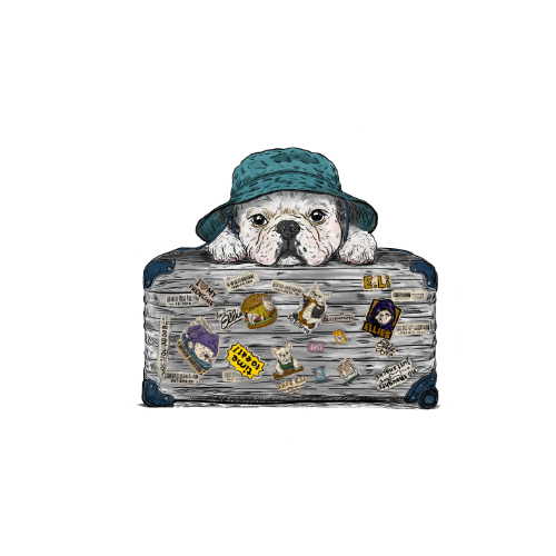 スーツケースに手を載せ、こちらを見つめるフレンチブルドッグ。