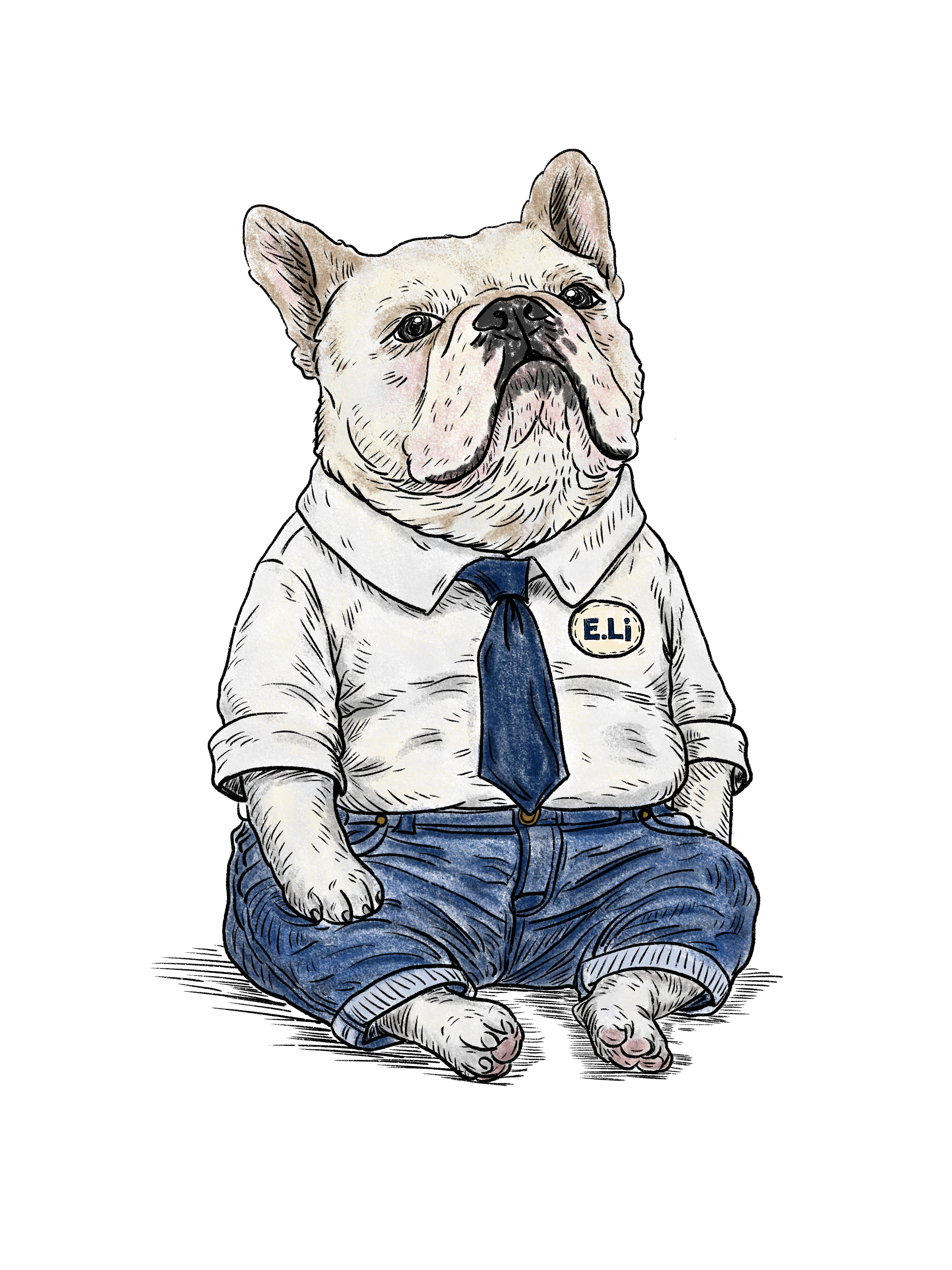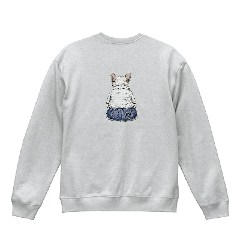フロントには、愛犬がちょこんと座っている姿をモチーフにしたイラストを配置しました。 日常の一瞬を切り取るような感覚で、あえて少しだけ服を着せ、E.Liらしい遊び心を添えています。 はなぺちゃ犬特有のお腹まわりのぽっちゃりとした丸みや、 短い脚とのバランスなど、体型のディテールにも細かくこだわりました。 顔はキリッとした表情でありながら、全体のシルエットはどこか愛くるしく、 そのギャップが自然に伝わるよう丁寧に描いています。 背面には、同じモチーフを後ろ姿で表現。 正面と背面を合わせることで、愛犬の存在感や佇まいがより立体的に感じられる構成にしました。 イラストのサイズは主張しすぎないバランスに抑え、 日常のコーディネートに自然と溶け込みながら、 着る人の気分にそっと寄り添う一枚に仕上げています。